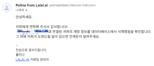 회원탈퇴 메뉴가 따로 없어 메일로 삭제 요청을 해야 합니다.