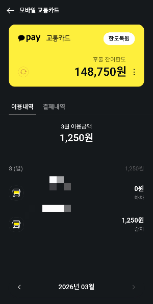 - 오류가 날까 봐 모바일 티머니는 삭제하고 카카오페이만 사용 중입니다.